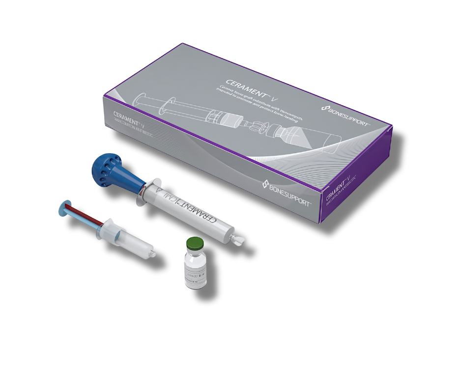 CERAMENT V es un relleno de huecos óseos sintético inyectable que consta de un 40 % de hidroxiapatita, un 60 % de sulfato de calcio y el antibiótico clorhidrato de vancomicina.